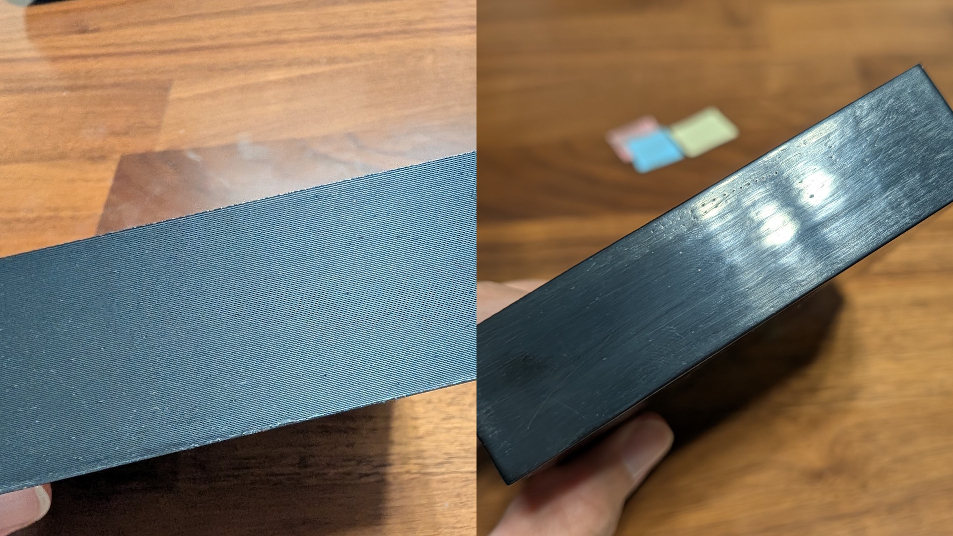 ↑の溶剤で溶かした面を追加で磨いてみた感じ、滅茶苦茶つるつるにはなるけど積層痕を消すほどのインパクトはないか、 積層痕を消したかったらよほど頑張らないとなって感じです。