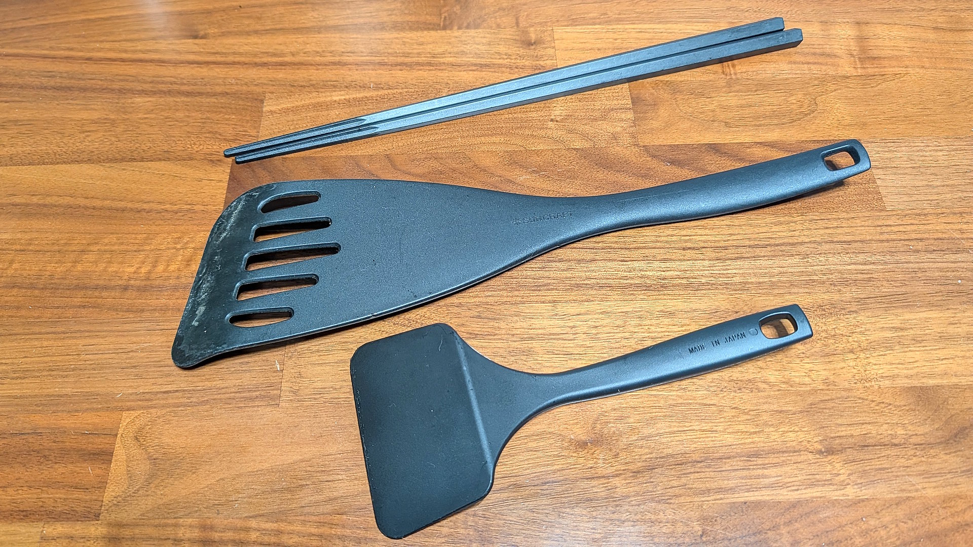 金属製だと昨今のテフロン式フライパンなどを傷つけたりするので、理想は木製なんだろうなぁと思います。 そこにこだわりを見せる必要性がどれほどあるのかは定かじゃないですけどね。