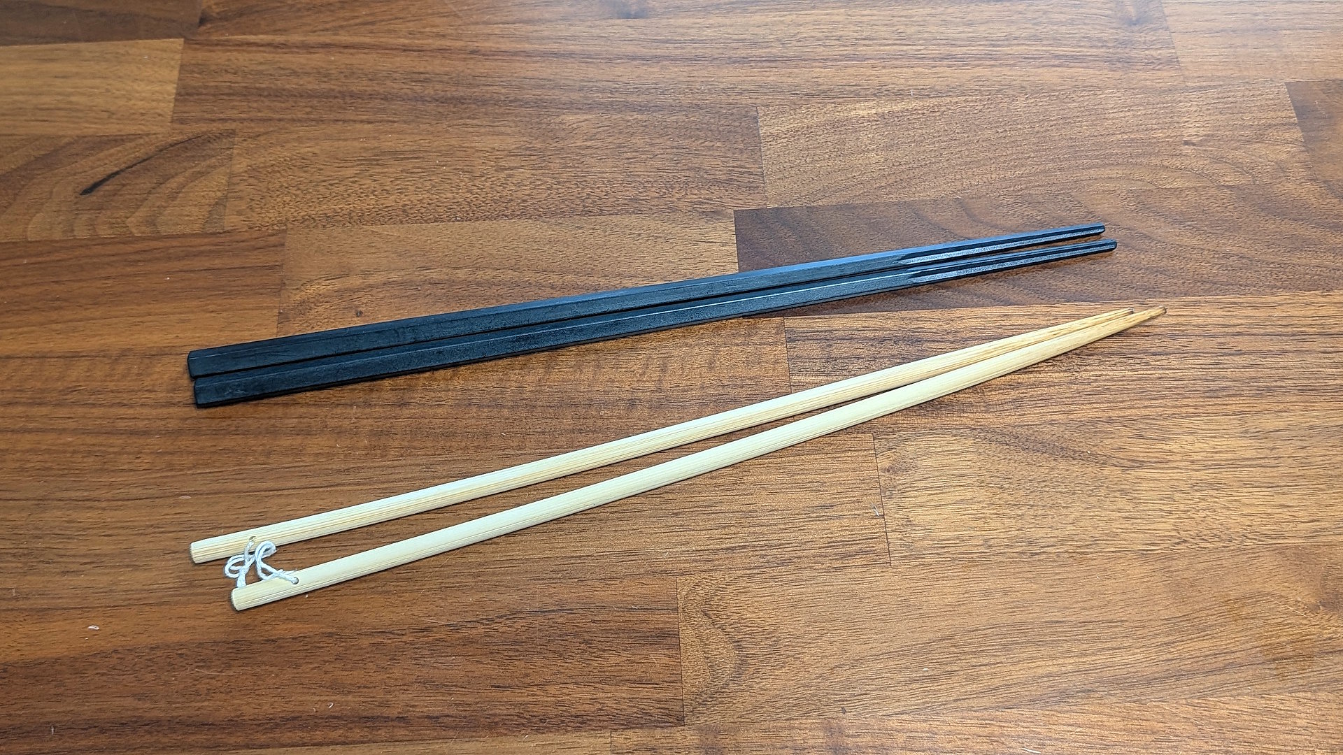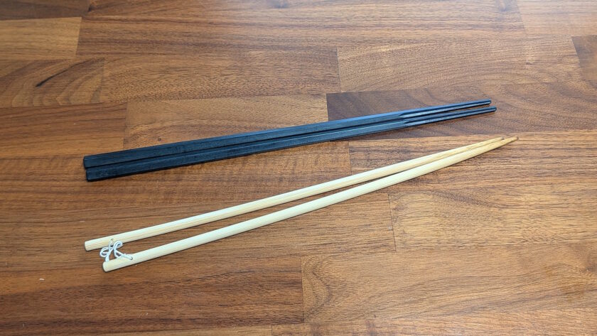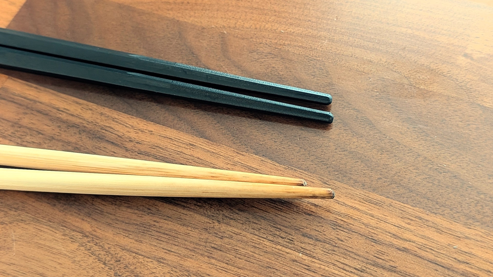 ところが実際には竹の菜箸より重たく、重心的にも使い難いんですよ。竹がそもそも撥水性が悪いわけでもないってのがより樹脂製を選ぶ必要性が無くなってくるんですよね。