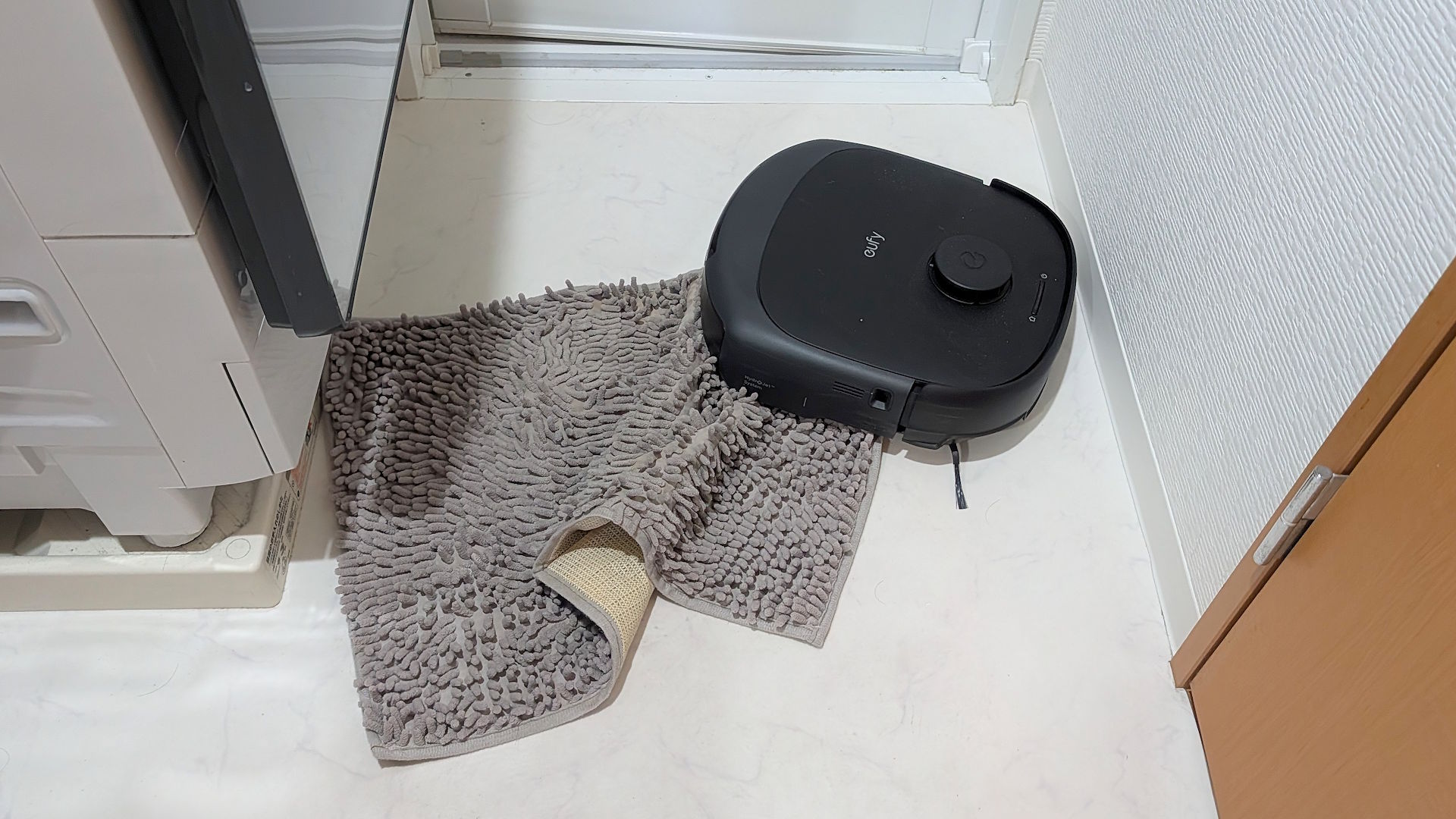 バスマットを上げて掃除させるか、そもそもバスマットを置いた状態でマッピングさせたり侵入禁止エリアに設定するか、する必要があります。