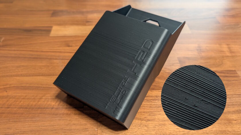 こちら先とほとんど変わらい条件で、0.4mm大流量ノズルで印刷した結果です。積層痕に見られる誤差は0.8mmと比較してかなり小さく表層はかなり綺麗ですね。